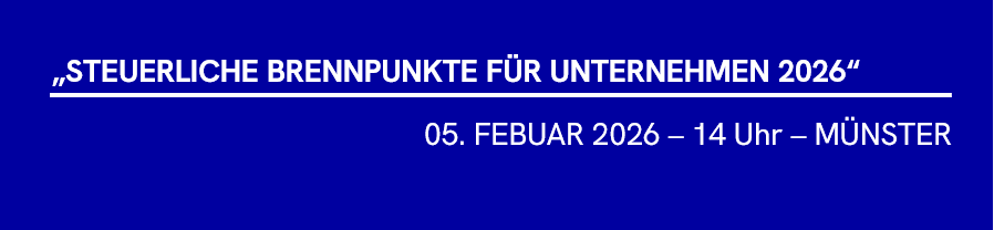 In der Zeit von 14:00 Uhr bis 18:00 Uhr werden wir Sie in unserem Bürogebäude, Am Mittelhafen 56 in Münster, sowie online über die "Highlights" des neuen Steuerjahres 2026 informieren.